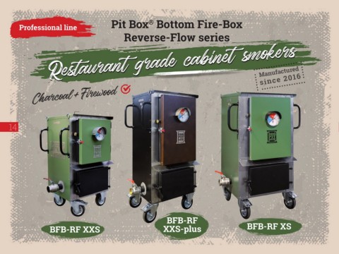 ® Professional line Pit Box Bottom Fire-Box Reverse-Flow series Restaurant grade cabinet smokers Restaurant grade cabinet smokers Manufactured Charcoal+Firewood since 2016 14 BFB-RF BFB-RF XXS XXS-plus BFB-RF XS