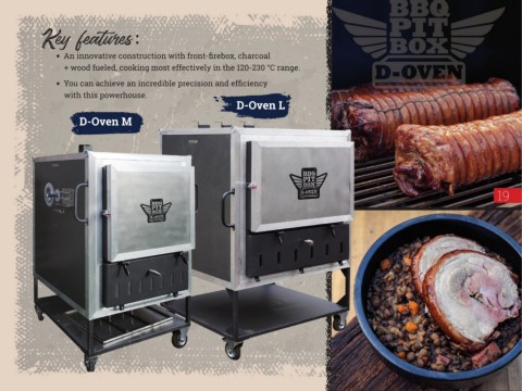 Key features: • An innovative construction with front-firebox, charcoal + wood fueled, cooking most effectively in the 120-230 °C range. • You can achieve an incredible precision and efficiency with this powerhouse. D-Oven L D-Oven M 19